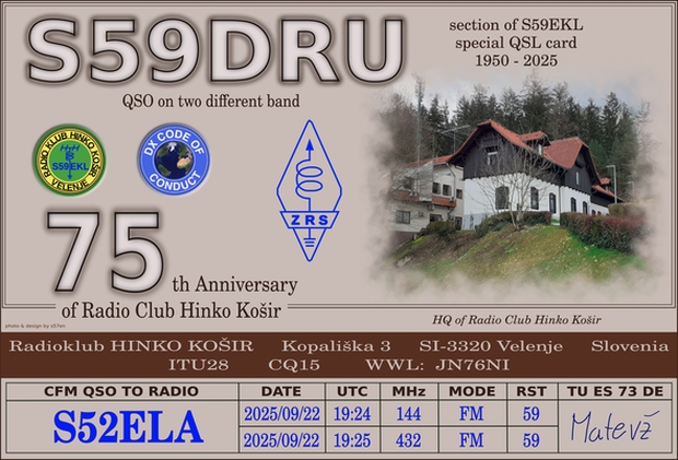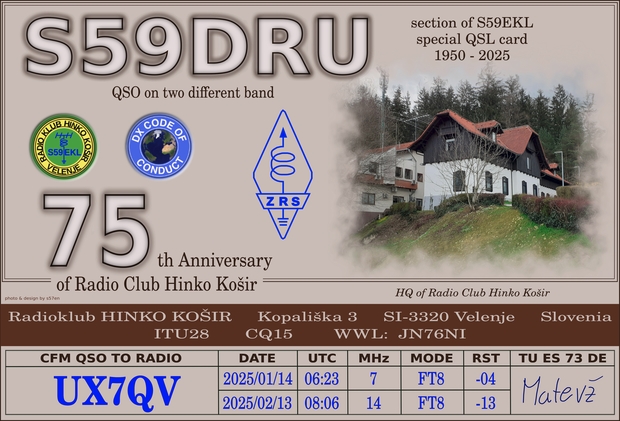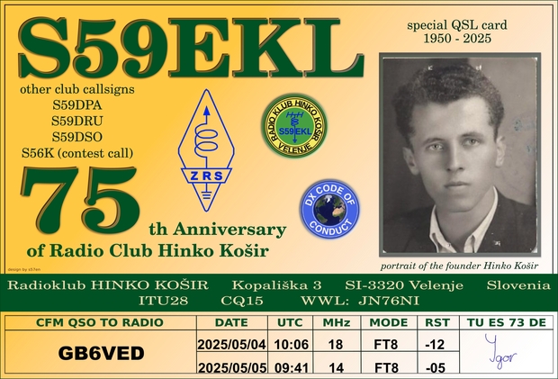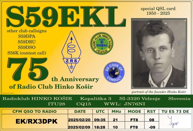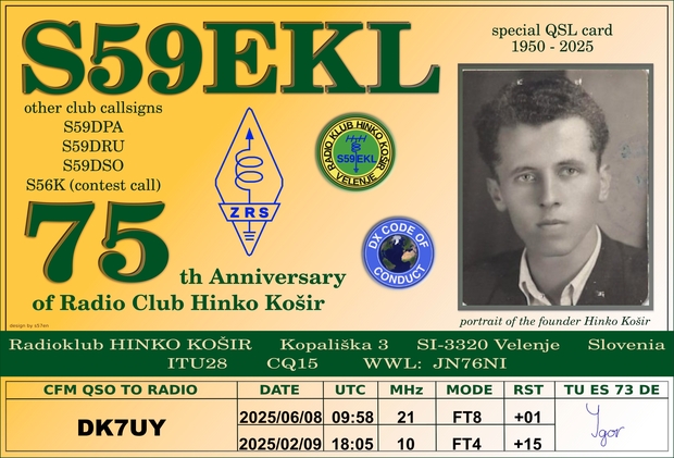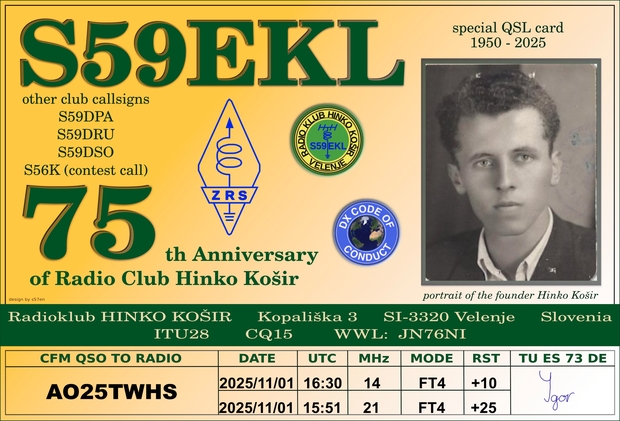 Priložnostna QSL kartica ob 75. letnici radiokluba Hinko Košir, v letu 2025.